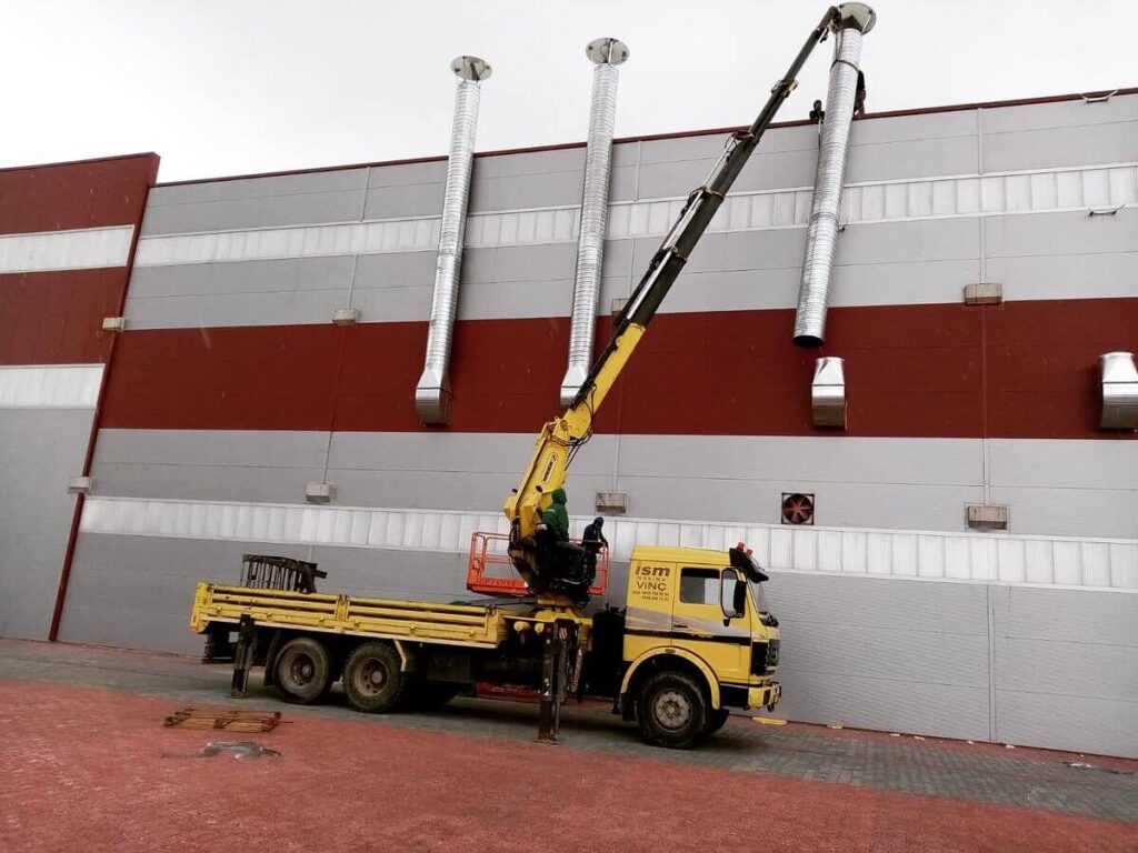 İnegölde vinç yardımıyla fabrika bacasının güvenli şekilde montajı ve yerleştirilmesi.